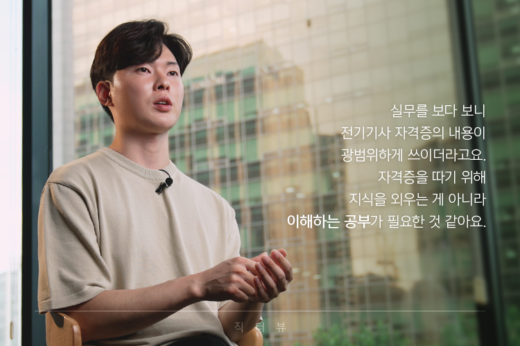 자격증이랑 영어요. 학생 때는 별생각 없이 스펙을 위해서 전기기사를 공부했는데요, 실무를 보다 보니 자격증의 내용이 광범위하게 쓰이더라고요. 자격증을 따기 위해 지식을 외우는 게 아니라 이해하는 공부를 할 것 같아요. 그리고 해외 업체들과 대화할 기회가 많은 것을 대비해서 원만하게 소통할 수 있도록 영어 회화도 많이 준비할 거 같고요.