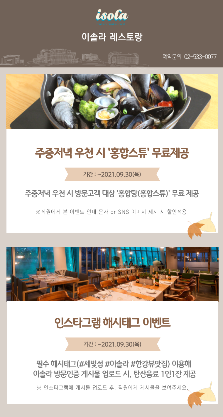 주중 저녁 비 오는 날 방문했다면, 이벤트 안내 문자나 이벤트 이미지를 직원에게 보여주시면 홍합스튜를 무료로 제공해드립니다. 또한, 이솔라 레스토랑 방문 인증샷을 필수 해시태그인 #세빛섬, #이솔라, #한강뷰맛집과 함께 업로드 후 직원에게 보여주시면, 탄산음료를 1인 1잔 제공합니다. 이솔라에서 소중한 사람과 함께 멋진 한강뷰를 바라보며 아름다운 저녁을 보내세요.