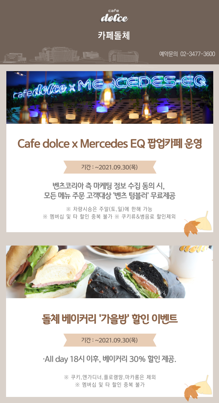 메르세데스-벤츠의 전동화 자동차 전용 서브 브랜드 메르세데스-EQ와 협업하여 9월 30일까지 팝업카페를 운영 중인 카페돌체에서는 벤츠코리아 측 마케팅 정보 수집 동의 시, 모든 메뉴 주문 고객에게 ‘벤츠 텀블러’를 선물로 드리고 있어요. 주말에는 차량 시승도 할 수 있죠.