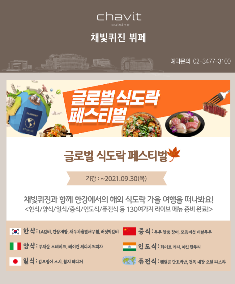 맛있는 음식을 먹는 것은 언제나 즐거운 일이죠. 뷔페 레스토랑 채빛퀴진의 9월은 세계여행을 떠난 듯한 ‘글로벌 미식회’입니다. 버섯떡갈비, 부추 깐풍 장어, 부채살 스테이크, 치킨 탄두리, 갑오징어 스시, 전복 내장 오일 파스타 등 한식, 중식, 양식, 인도식, 일식, 퓨전식 130여 가지 라이브 메뉴가 준비되어 있습니다. 나라별로 대표 음식을 맛있게 즐길 수 있는 시간이니 올가을엔 세빛섬에서 전 세계로 식도락 여행을 떠나보세요.