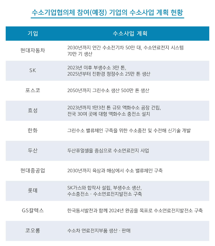 수소기업협의체 설립을 주도하는 4개 그룹은 수소사회 구현을 위해 저마다의 목표를 세우고 지속적으로 노력해오고 있어요. 현대자동차는 2030년까지 연간 수소전기차 50만 대, 수소연료전지 시스템 70만 기 생산을 목표로 하고 있고, SK는 2023년 이후 부생수소 3만 톤, 2025년부터 친환경 청정수소 25만 톤 등의 생산을 계획하고 있습니다. 포스코는 2050년까지 그린수소 생산 500만 톤 생산을 목표로 하고 있고, 효성은 2023년까지 1만3천 톤 규모의 액화수소 공장 건립과 전국 30여 곳에 대형 액화수소 충전소 설치를 계획하고 있습니다.