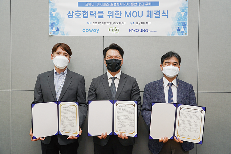 효성화학과 코웨이, 이지에스가 8월 26일 반포 사옥에서 폴리케톤의 안정적인 공급을 위한 MOU를 맺었다. 코웨이는 유해 물질 검출 문제에서 자유로운 친환경 플라스틱인 폴리케톤을 정수기 부품 소재로 사용해왔다. 폴리케톤은 제조 시 이산화탄소 배출이 적은 친환경 소재로, 외부 환경을 견디는 힘과 안전성이 뛰어나 일상생활에서 다양하게 쓰이고 있다. 이날 협약식에 참여한 또 다른 고객사 이지에스는 폴리케톤 공급 대리점을 통합해 가격을 통일하고 수급 안정성 문제를 해결했다.