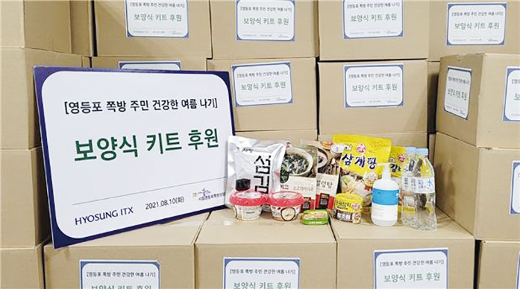 효성ITX가 8월 10일 영등포 쪽방촌 거주민과 자활 노숙인을 위해 영양식 키트 150개를 전달했다. 말복을 맞이해 준비한 영양식 키트에는 간편하게 조리해 먹을 수 있는 삼계탕, 설렁탕 등 보양식과 손 소독제 등 방역 용품이 포함됐다.
