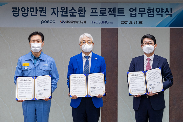 그리고 최근에는 포스코와 여수광양항만공사와 함께 광양만권 자원순환 MOU를 체결하기도 했어요. 포스코는 광양제철소 내 폐페트병을, 여수광양항만공사는 항만 내 폐페트병을 수거하고, 효성티앤씨가 리젠 원사를 생산하는데요, 이렇게 생산된 리젠은 포스코 광양제철소의 근무복, 안전조끼와 같은 제품과 지역 내 사회적 기업을 통해 다양한 굿즈로도 제작될 예정입니다.