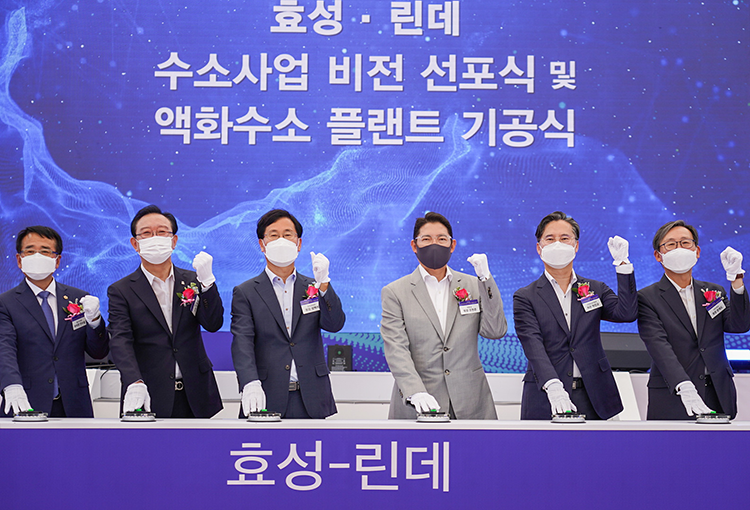 2021년 6월 21일 울산 용연공장에서는 ‘효성-린데 수소 사업 비전 선포 및 액화수소 플랜트 기공식’이 열렸는데요. 이날 효성그룹 조현준 회장은 “수소 에너지는 인류의 미래를 바꿀 에너지 혁명의 근간”이라는 메시지와 함께, 향후 5년간 액화수소 생산 증대를 위한 1조 원 투자 계획을 밝히기도 했습니다. 국내 수소충전시스템 시장점유율 1위 기업인 만큼, 효성중공업은 액화수소 공장 완공과 함께 대한민국 수소경제의 미래를 견인할 것입니다.