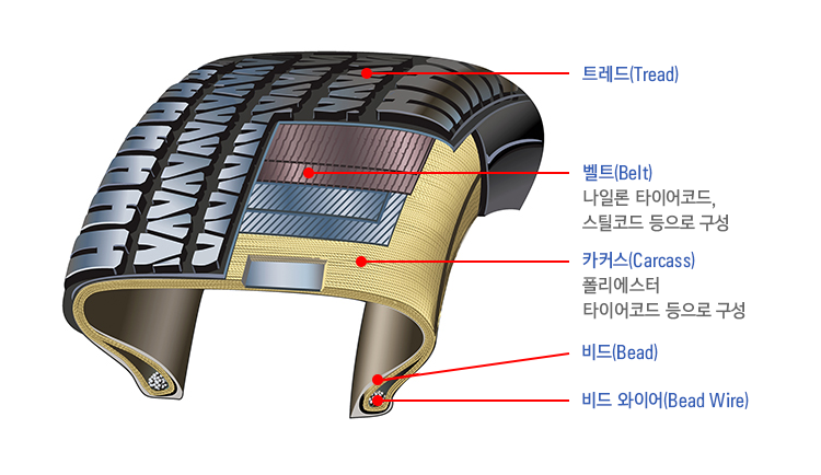 타이어는 자동차와 노면 사이에서 한정된 접촉면을 가져 차의 무게를 지탱하고 노면의 충격과 진동을 흡수하는 역할을 합니다. 타이어의 구조를 살펴보면 크게 트레드(Tread), 카커스(Carcass), 비드(Bead)로 구성돼 있죠. ‘트레드’는 도로와 직접 접촉하는 부분으로 가속과 제동, 승차감 등과 관련이 있습니다. ‘카커스’는 타이어의 모양을 유지해주는 뼈대. 덕분에 자동차의 하중을 견디고, 외부의 충격을 흡수합니다. ‘비드’는 타이어를 림에 고정해 높은 압력의 공기가유지되도록 돕죠. 추가적으로 트레드와 카커스 사이에 있는 ‘벨트’는 주행 시 노면 충격을 감소시킵니다. 또 트레드가 노면에 닿는 부위를 넓게 유지해 주행 안정성을 높입니다.