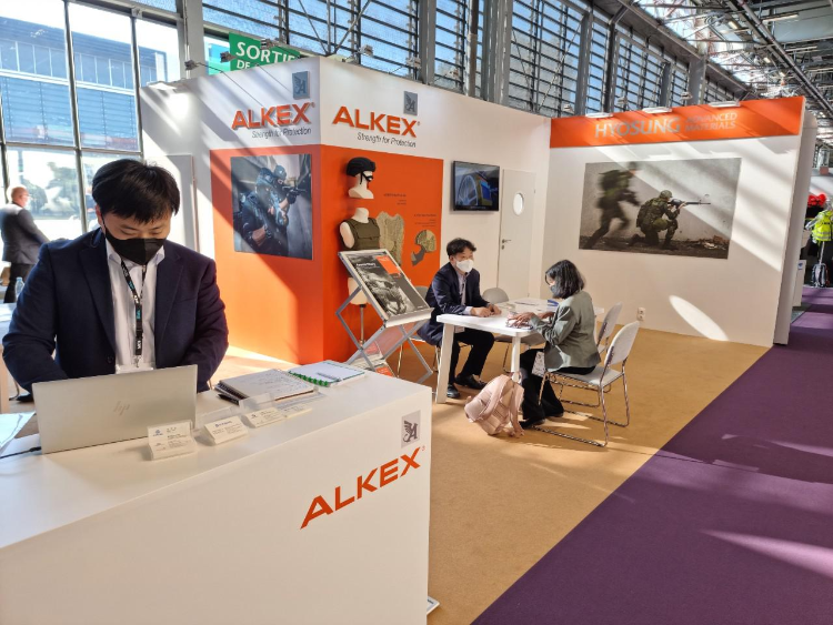 효성첨단소재가 10월 19일부터 22일까지 프랑스 파리에서 열린 국제 방위산업 전시회 ‘밀리폴 파리(Milipol Paris) 2021’에 참가해 아라미드 섬유 *알켁스(ALKEX®)가 적용된 경량화 방탄복/방탄헬멧을 선보입니다.