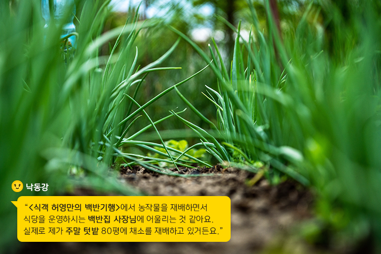 “<식객 허영만의 백반기행>에서 농작물을 재배하면서 식당을 운영하시는 백반집 사장님에 어울리는 것 같아요. 실제로 제가 주말 텃밭 80평 운영하여 배추, 무, 콩, 마늘, 양파 등을 재배 중이거든요. ^^”