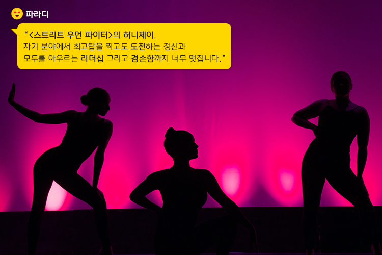 “스우파 허니제이 믓찌다 믓찌다 우리언니! 자기 분야에서 최고탑을 찍고도 도전하는 정신과 모두를 아우르는 리더십 그리고 겸손함까지 너무 멋집니다. 자기가 좋아하는 일을 잘할 수 있고 물질적으로도 이득을 얻을 수 있다니 얼마나 행복한 일인가 싶어요.”