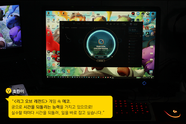 “리그 오브 레전드 게임 속 캐릭터 '에코'. 궁으로 시간을 되돌리는 능력을 가지고 있으므로! 실수할 때마다 시간을 되돌려, 일을 바로 잡고 싶습니다!”