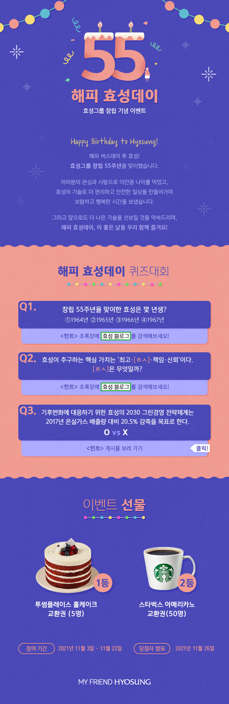 해피 효성데이, 효성그룹 창립 55주년을 함께 즐기기 위해 이벤트에 참여해준 55분께 푸짐한 선물을 드립니다!