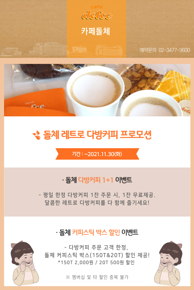 세빛섬의 카페돌체에서는 평일에 다방커피 1잔 주문 시, 1잔 더 드리는 1+1 이벤트를 진행합니다. 누구나 좋아하는 그 맛, 추억의 다방커피를 함께 즐겨보세요. 또한, 다방커피 주문 고객에게는 돌체 커피스틱 박스 할인하여 판매합니다. 150T 제품은 2,000원, 20T 제품은 500원 할인해드립니다. 집에서도, 피크닉이나 캠핑을 즐길 때도 카페돌체의 다방커피를 즐겨보세요.