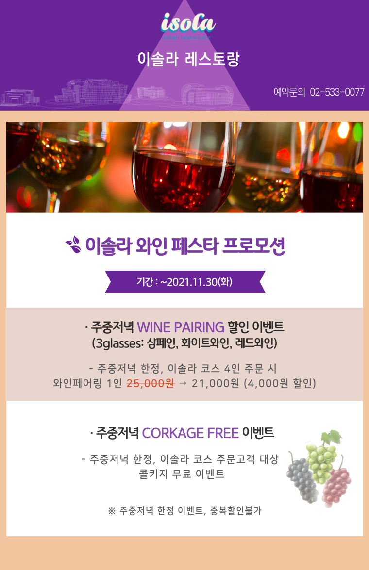 이솔라 레스토랑에서는 주중저녁 와인 페어링 할인 이벤트를 진행합니다. 주중저녁 이솔라 코스 4인 주문 시, 와인페어링(샴페인, 화이트와인, 레드와인, 총 3잔)을 21,000원(정상가 25,000원)에 제공해드립니다. 또한, 주중저녁 이솔라 코스 주문 고객 대상으로 콜키지도 무료이니, 맛있는 음식과 와인을 맘껏 즐겨보세요.
