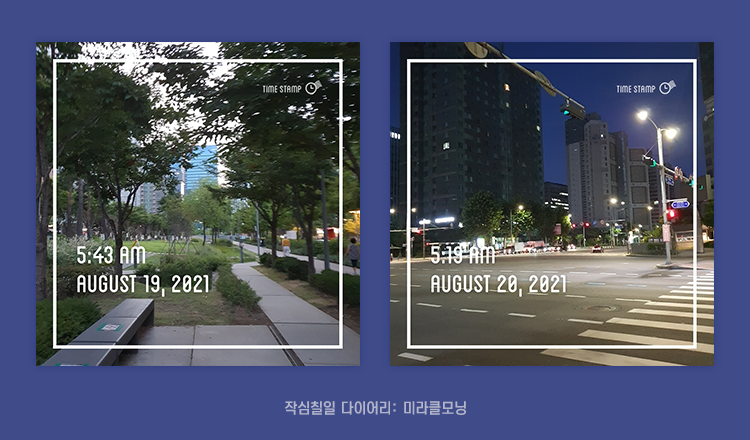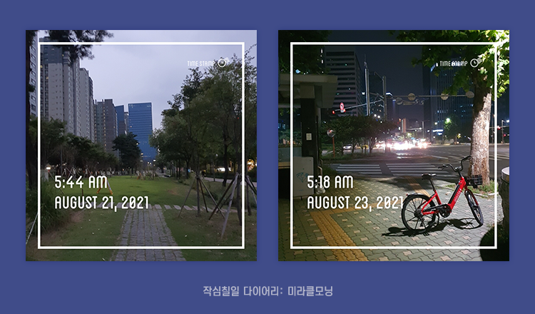 이번 미라클모닝 도전을 통해 고요한 아침 시간을 건강하게 보낼 수 있어서 뿌듯했고, 이를 계기로 러닝에 재미가 생겨 한 달이 지난 지금도 꾸준히 하고 있어요. 첫날 2분 뛰던 인터벌 러닝에서 지금은 10분으로 늘어나는 성장도 있었고, 요즘은 10분 정도 독서도 하고 있습니다. 5시에 일어나는 것은 제 기준에 너무 이른 것 같아서 무리하지 않고 6~7시 사이에 일어나서 출근 전 생산적인 일을 하려고 노력하고 있어요.