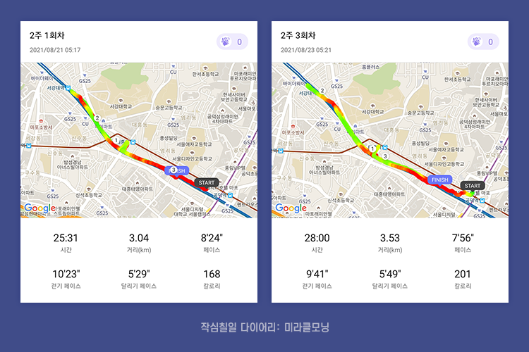 4일 차에는 혹시나 일어나기 싫을까 봐 전날 밤에 운동복을 입고 잤습니다. 미적대며 일어나기 싫었는데 저녁에 술 약속이 있어서 내일 못 일어날 것을 알았기에, 다시 마음을 다잡고 일어났죠. 4일 차라고 인터벌 러닝도 뛰는 시간이 조금씩 더 길어지고, 언제나처럼 뛰고 나서 느끼는 뿌듯함은 덤입니다.