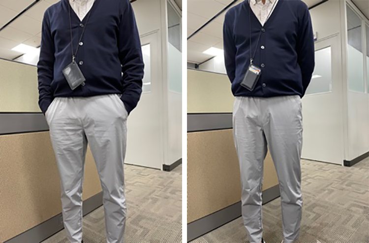 우선 크레오라로 만든 이 스포츠 슬랙스는 외관이 깔끔하고 점잖아 보이고, 신축성과 복원력이 좋아 소재가 탄탄한 느낌이 납니다. 또한 착용했을 때 추리닝처럼 흐늘거리지 않고 핏을 유지하고 있어 출근 복장으로도 가능해요.