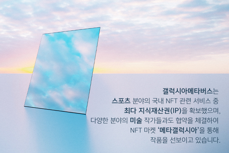 갤럭시아메타버스는 NFT 마켓 출시를 위해 스포츠, 디지털아트, 방송, 엔터테인먼트 등 다양한 분야의 NFT 콘텐츠 지식재산권(IP)을 확보했습니다. 특히, 스포츠 분야의 국내 NFT 관련 서비스 중 최다 IP를 확보하고 있죠. 미술 분야에서도 사진, 캐릭터 및 일러스트, 동양화 등 다양한 분야의 작가들과 협약을 체결했습니다. 현재 사진작가 임채욱, 아티스트그룹 ManeCrew(메인크루), 어도비가 선택한 국내 일러스트레이터 CJroBlue(최정현), 동양화 프로젝트 그룹 오색빛닮과 그래픽 아티스트 &(박준식)작가의 NFT 작품들이 매주 화, 금요일에 소개되고 있어요.