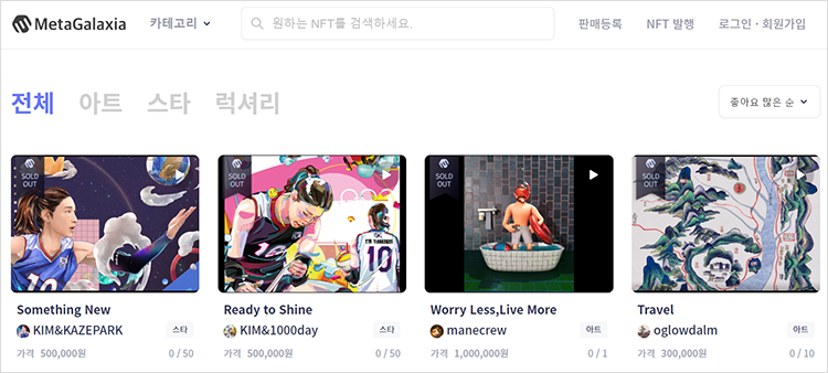 갤럭시아메타버스는 갤럭시아머니트리의 자회사로 다양한 디지털 자산을 NFT로 발행, 판매, 유통, 관리하는 블록체인 전문기업입니다. 일단 거래가 있으려면 고퀄리티의 NFT 작품들이 필요하잖아요. 그래서 메타갤럭시아(Metagalaxia)라는 NFT 거래 플랫폼을 만들고 여기에 여러 유명작가의 작품과 스포츠 스타의 NFT를 발행하고 있어요.