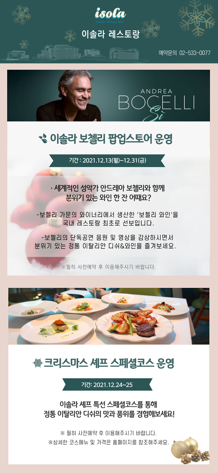 안드레아 보첼리, 클래식에 관심 없는 분들도 다 알만큼 세계적인 성악가죠. 이솔라 레스토랑에서는 안드레아 보첼리와 함께 12월을 준비했어요. 보첼리 가문의 와이너리에서 생산한 ‘보첼리 와인’을 국내 레스토랑 최초로 선보이고요. 이 와인과 이탈리안 디쉬를 보첼리의 단독 공연 음원 및 영상을 감상하며 더 분위기 있게 즐기실 수 있어요. 12/13(월)부터 12/31일까지 이솔라 보첼리 팝업스토어로 운영되니, 반드시 사전 예약하고 이용해주세요. 또한, 크리스마스 이브와 당일에는 이솔라 셰프 특선 스페셜코스를 즐기실 수 있으니, 미리 예약하셔서 완벽한 크리스마스를 준비하시길 바랍니다.