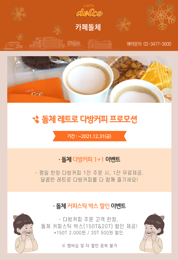 맛있는 식사 후 따뜻한 커피 한잔 빠질 수 없겠죠? 카페돌체에서는 돌체 다방커피 1+1 이벤트를 진행합니다. 달콤한 데이트 후 달콤한 돌체 다방커피 한 잔씩 하세요! 또한, 다방커피 주문 고객에게는 돌체 커피스틱 박스 할인 이벤트도 진행 중인데요, 언제 어디서나 카페돌체의 맛있는 커피를 즐길 수 있는 기회니 놓치지 마시길!