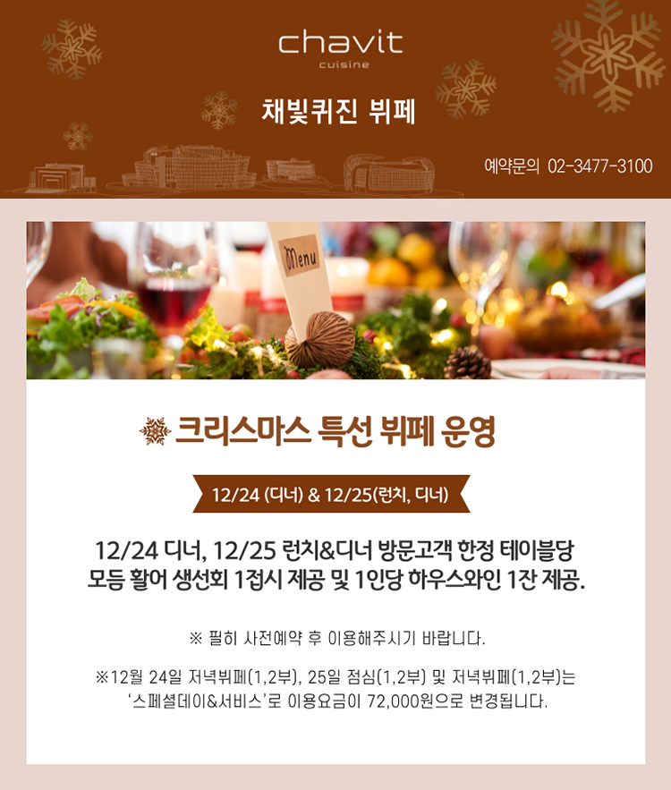 크리스마스 이브와 크리스마스 당일, 세빛섬 채빛퀴진에서는 특별한 뷔페를 준비했습니다. 12/24 디너와 12/25 런치&디너 고객에게 테이블당 모듬 활어 생선회 1접시와 1인당 하우스와인 1잔을 제공합니다. 날씨는 추워도 마음만은 따뜻한 크리스마스, 채빛퀴진에서 더 즐겁게 보내보세요. (12/24 디너, 12/25 런치&디너는 ‘스페셜데이&서비스’로 이용요금이 72,000원으로 변경됩니다.)