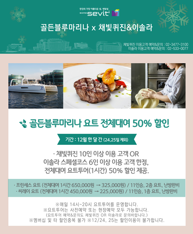 12월 한 달간, 채빛퀴진 10인 이상 이용 고객 또는 이솔라 스페셜코스 6인 이상 이용 고객에게는 골든블루마리나 전체 대여 요트투어(1시간)를 50% 할인해드립니다. 11인승 2층 요트인 프린세스 요트는 325,000원(정상가 650,000원)에, 11인승 1층 요트 씨레이 요트는 225,000원(정상가 450,000원)에 즐기실 수 있어요. 난방시설도 완비되어 있으니, 추위 걱정 마시고 한강 위에서 특별한 시간을 보내시길 바랍니다.