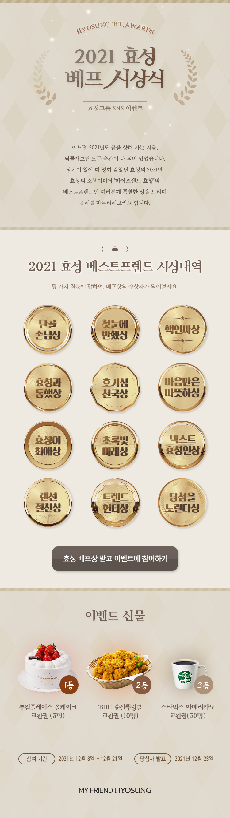 올 한 해 효성그룹 블로그와 포스트를 찾아주신 모든 분께 감사드립니다. 효성의 소식을 전하고, 효성의 제품과 기술을 소개하며, 효성인의 이야기를 통해 여러분께 더 가까이 다가가고 싶었습니다. 저희의 이런 마음 잘 전해졌을까요? 효성그룹 소셜미디어 ‘마이프렌드 효성’의 베스트프렌드인 여러분께 감사의 마음을 담아 특별한 상을 드리며 2021년을 마무리하려고 합니다. 이벤트에 참여하여 효성 베프상 수상자가 되신 분들 중 추첨을 통해 12월 24일 크리스마스 이브에 케이크, 치킨, 아메리카노 등 푸짐한 선물을 보내드려요!