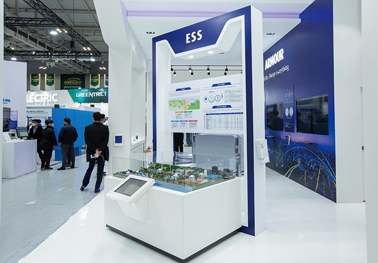에너지 저장 장치 ESS에 대한 관심도 높았습니다. 효성중공업은 전력 변환 장치(PCS), 배터리, 에너지 관리 시스템(EMS) 등 ESS 시스템 전체에 대한 설계•공급부터 설치 후 10년간 유지 보수 관리에 이르기까지 ESS 시스템의 토털 솔루션을 제공합니다.