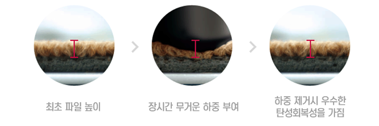 벌키(BULKY) 가공처리한 카페트는 푹신한 맛이 있어 밟았을 때의 느낌이 좋습니다. 그리고 회복력이 뛰어나 밟고 난 뒤 곧 원래 상태로 회복이 되어 제 모양을 잃지 않습니다.