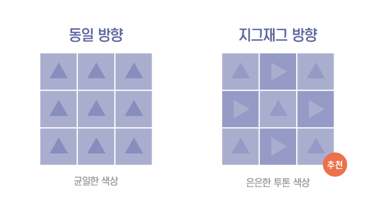 롤 카페트는 해당 사항이 없지만, 타일 카페트는 방향성이 있어요. 타일 뒷면에 화살표가 표시되어 있는데요, 방향을 엇갈리게 시공하게 되면 같은 색의 타일이더라도 투톤으로 시공이 가능합니다.