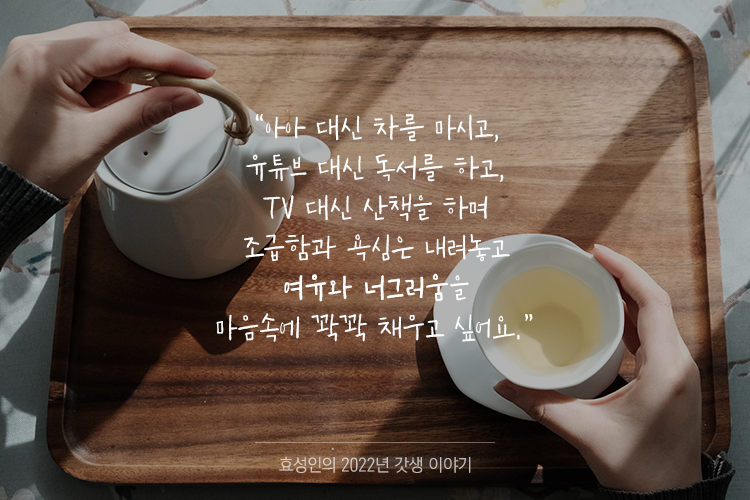 “우아해지기~ 내년에는 급한 성격을 내려놓고 좀 더 천천히 시간을 다스려 보려고 계획하고 있습니다. 조급함과 욕심은 내려놓고 여유와 너그러움을 마음속에 꽉꽉 채울 예정이에요. 차분함을 위하여 아이스 아메리카노 대신 차를 마시고, 유튜브 대신 독서를 하고, TV 대신 산책을 할 계획입니다. 마음의 변화부터 시작하자!!”