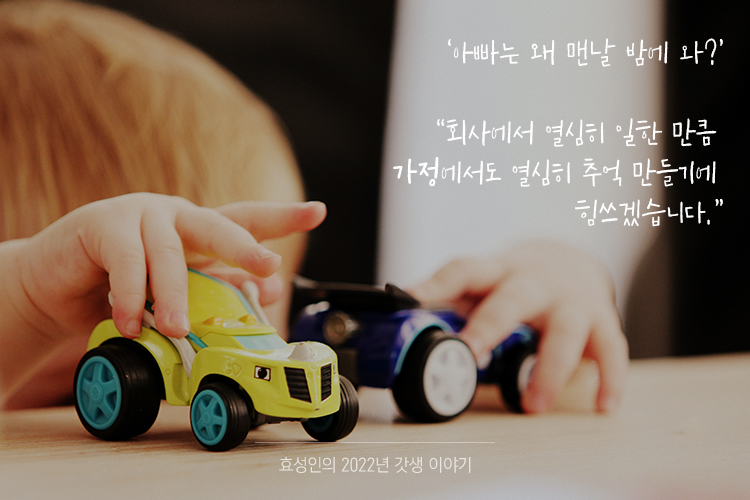 “아이가 태어나고 걷고, 말을 하게 되면서 가장 많이 듣는 말은 ‘아빠는 왜 맨날 밤에 와?’네요. 22년에는 워라밸을 맞춰서 회사에서 열심히 일한 만큼 가정에서도 열심히 추억 만들기에 힘쓰겠습니다. 모든 아빠들 화이팅!!”