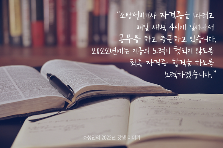 “2021년 여름에 목표로 잡은 소방설비기사 자격증 취득!! 현재 필기 합격하고 내년 1회차 실기를 준비하고 있습니다. 바쁜 업무와 집안일로 인해 매일 새벽 4시에 일어나서 공부를 하고 출근하고 있습니다. 2022년에는 지금의 노력이 헛되지 않도록 실기까지 포함해서 최종 자격증 합격을 하도록 노력하겠습니다. 아자아자 파이팅!"