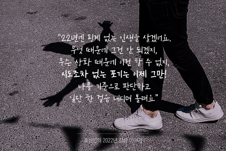 “22년엔 핑계 없는 인생을 살겠어요. 무엇 때문에 그건 안 되겠지, 무슨 상황 때문에 이건 할 수 없지, 시도조차 없는 포기는 이제 그만! 나를 기준으로 판단하고 일단 한 걸음 내디뎌 볼래요.”