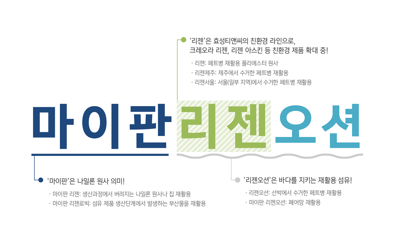 친환경에 진심인 게 보이시죠? 효성이 한 일은 친환경 제품의 가지 수를 늘리는 게 목적이 아니에요. 버려진 것을 수거하고 이를 다시 제품을 만드는 ‘자원의 선순환 시스템’을 만드는 게 목적인 것이죠.
