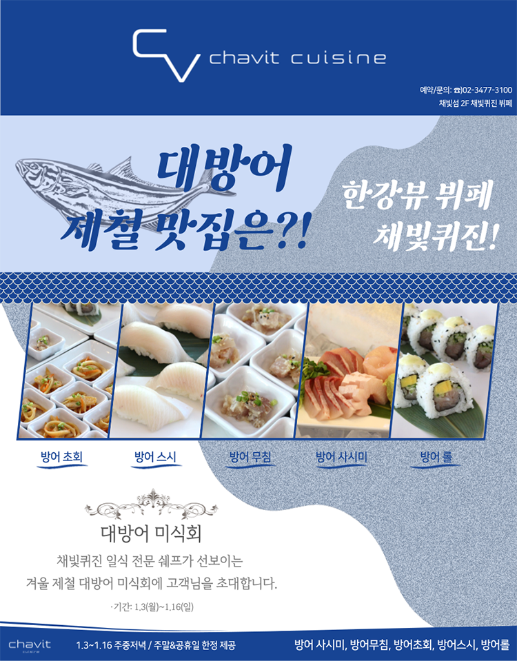 겨울이 반가운 이유는 물론 여러 가지가 있겠죠. 동심으로 돌아가게 만드는 눈과 추위를 녹여줄 따뜻한 어묵 국물과 붕어빵, 이불 속에서 까먹는 상큼한 귤까지. 그리고 이것도 겨울을 행복하게 만드는 별미죠. 바로 대방어! 일식 전문 셰프가 준비한 다양한 대방어 요리를 맛볼 수 있는 채빛퀴진의 겨울은 여러분께 활짝 열려있어요. 방어 초회, 방어 스시, 방어 무침, 방어 사시미, 방어 롤 등 제철 대방어 메뉴가 1월 16일까지 주중저녁과 주말, 공휴일에 제공됩니다.