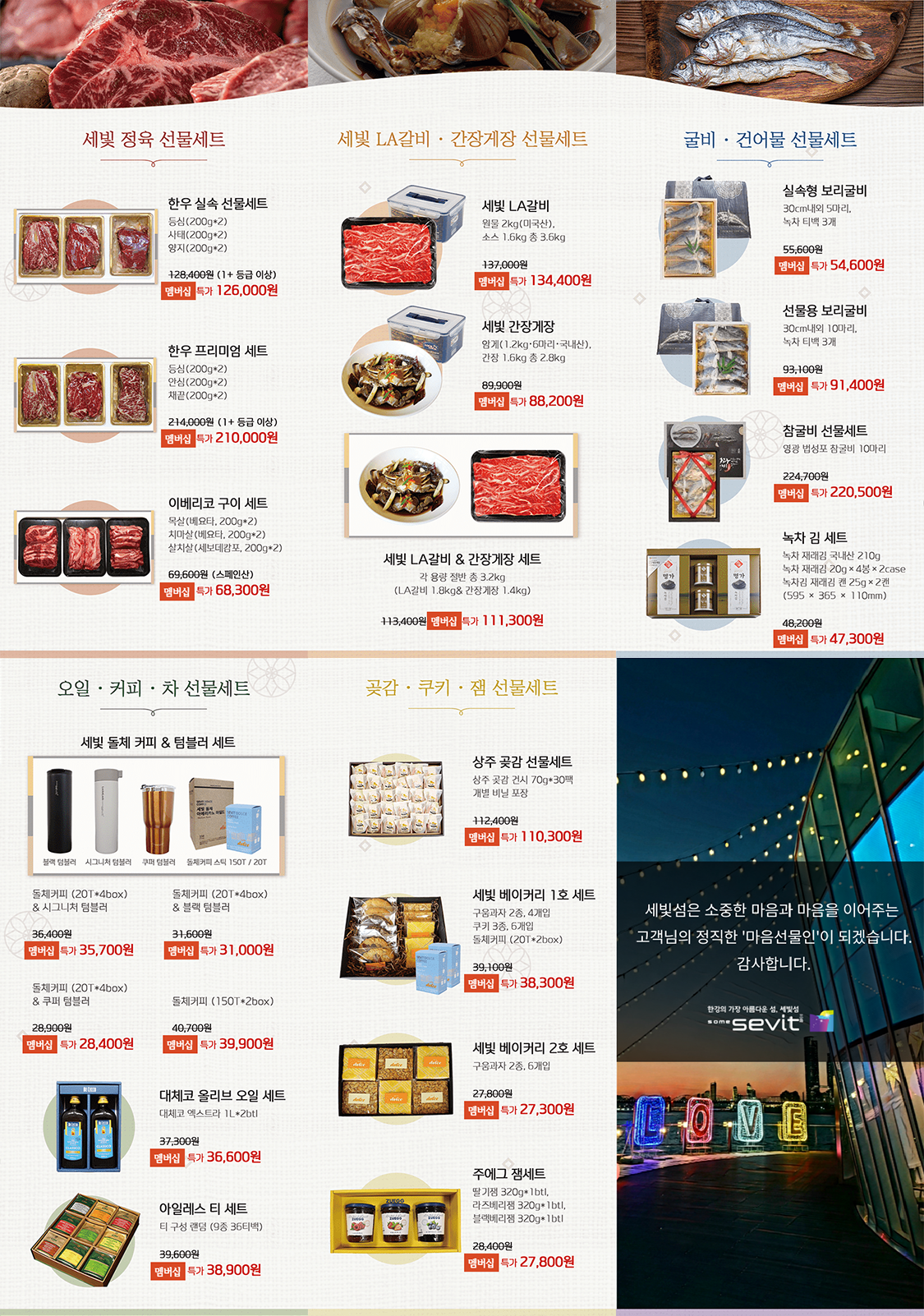 한우와 이베리코, LA갈비, 간장게장, 굴비와 김도 있고요. 세빛 돌체 커피&텀블러 세트, 올리브오일과 티, 달콤한 곶감과 쿠키, 잼도 준비했습니다. 일반 고객 대상으로는 정상가로, 멤버십 회원 대상으로는 특별 할인가로 제공하고 있습니다.