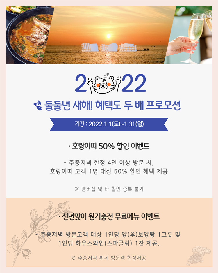 2022 둘둘년 새해를 맞이하여 혜택도 두 배로 준비했습니다. 주중저녁 4인 이상 방문 시, 호랑이띠 고객 1인에게는 50% 할인을 제공합니다. 또한, 주중저녁 방문고객 1인당 양(羊)보양탕 1그릇과 하우스와인(스파클링) 1잔도 무료로 드려요!