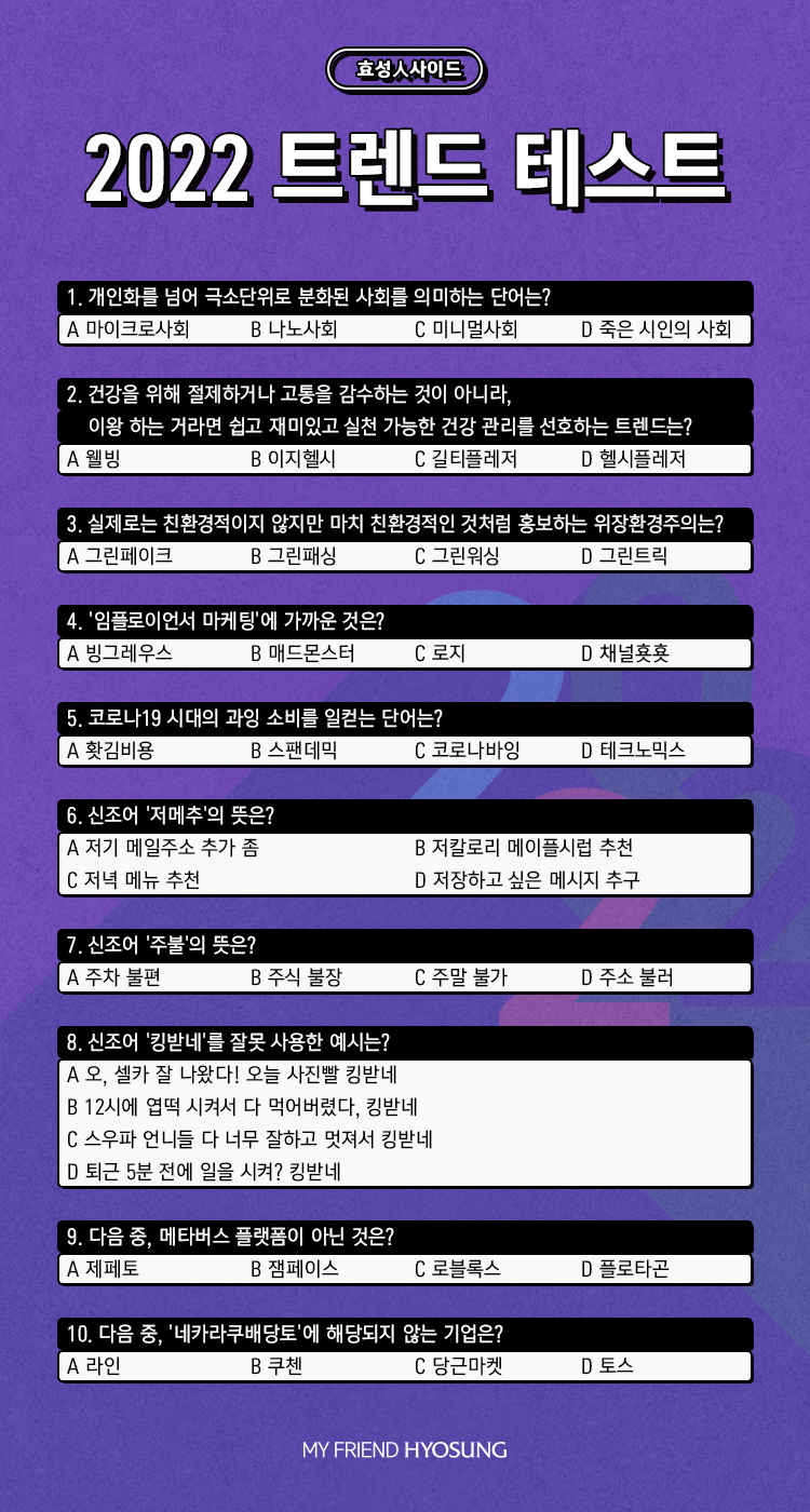 효성의 현직 직장인, 효성인의 생각과 마음을 들여다보는 <효성人사이드>! 열두 번째 주제는 ‘2022 트렌드 테스트’입니다.