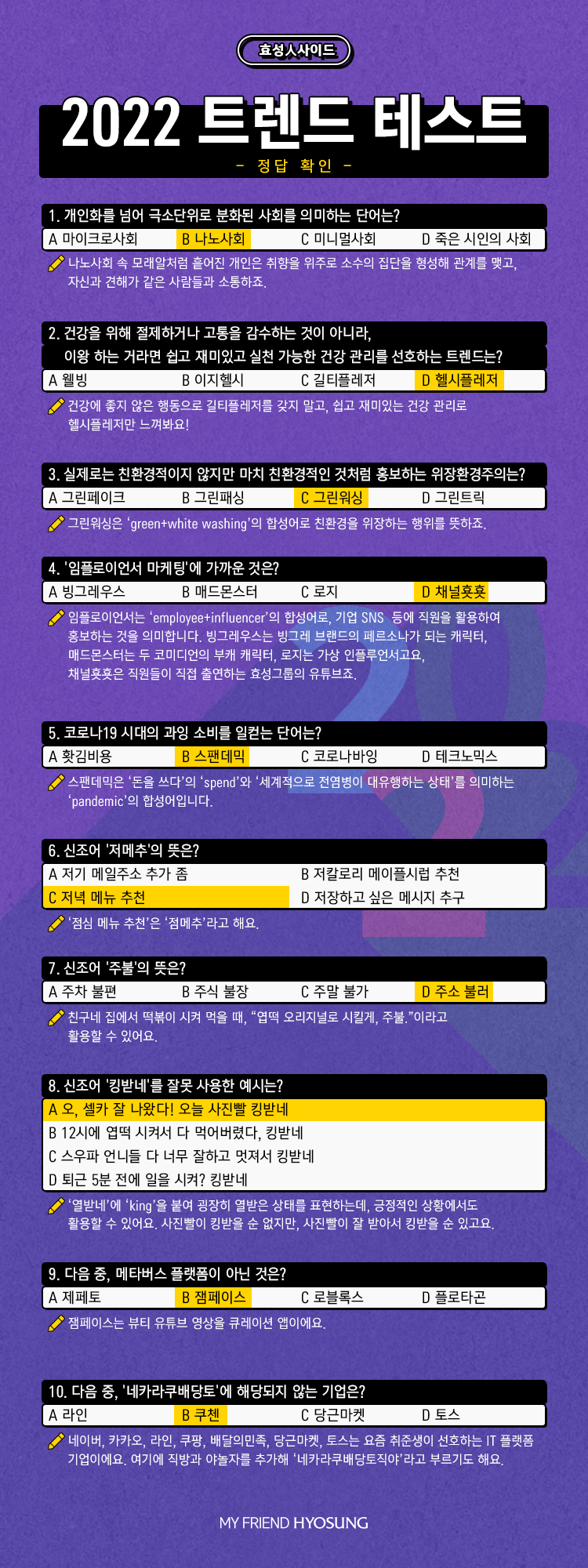 “20대인데도 50점 나와서 당황했어요...ㅋㅋㅋ 앞으로 신조어 공부도 따로 해야겠다는 생각이 듭니다. 유행을 따라가는 게 아니라 트렌드를 읽음으로써 사회를 알아가는 거니까요!”