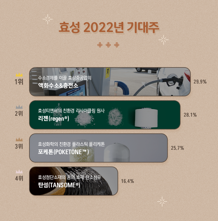 효성티앤씨의 친환경 리사이클링 원사 리젠(regen®), 수소경제를 이끌 효성중공업의 액화수소&충전소, 효성첨단소재의 꿈의 소재 탄소섬유 탄섬(TANSOME®), 효성화학의 친환경 플라스틱 폴리케톤 포케톤(POKETONE™). 이중 가장 많은 득표를 받은 효성 2022년 최고의 기대주는 바로 ‘액화수소&충전소’(29.9%)입니다. 수소차뿐만 아니라, 지속가능한 미래로 나아가기 위한 에너지인 수소이기에 많은 분의 기대가 큰데요, 효성은 이러한 기대에 보답하고자 더 열심히 수소사회를 일궈내겠습니다. 물론 섬유와 첨단소재, 화학 등 다양한 사업 분야에서도 활약할 거고요!