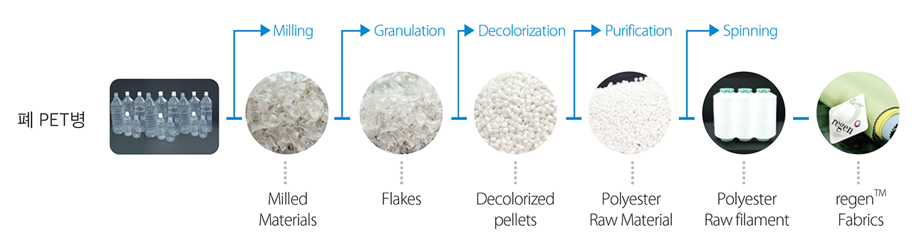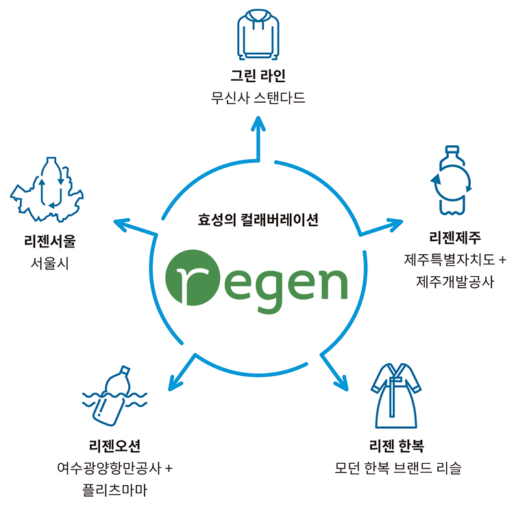위 보도 자료 내용에도 언급돼 있듯, 리젠은 폐 페트병을 재활용하여 만든 100퍼센트 리사이클 폴리에스터 원사예요. 효성은 리젠을 다양한 의류 및 액세서리에 접목함으로써 친환경 제품의 일상화를 이끄는 데 앞장서고 있습니다. 이를 위해 대중에게 친숙한 여러 패션 브랜드들과의 협업을 지속하는 중이죠.