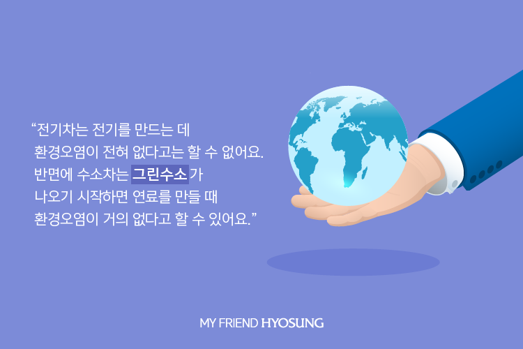 정말 그래요. 저도 효성의 구성원이 된 지 얼마 되지 않았지만, 점점 저도 모르는 사이에 환경을 생각하는 소비에 익숙해져 있더라고요. 티셔츠 한 장, 가방 하나를 사더라도 친환경 섬유로 만든 것인지 검색하게 되었거든요. 그런데 이제는 환경을 위해서 전기차와 수소차를 고민하고 있으니 말 다 했죠.