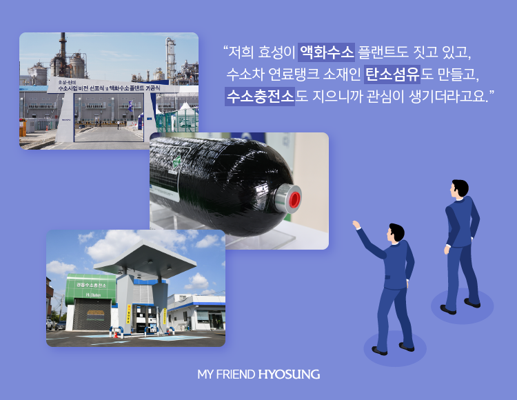 “아, 그러시구나. 하하. 그럼요, 대리님. 혹시 차 사실 때 전기차와 수소차 중에 어떤 걸 살지 고민은 안 해보셨어요? 저희 효성이 액화수소 플랜트도 짓고 있고, 수소차 연료탱크 소재인 탄소섬유도 만들고, 수소충전소도 지으니까 관심이 생기더라고요.”