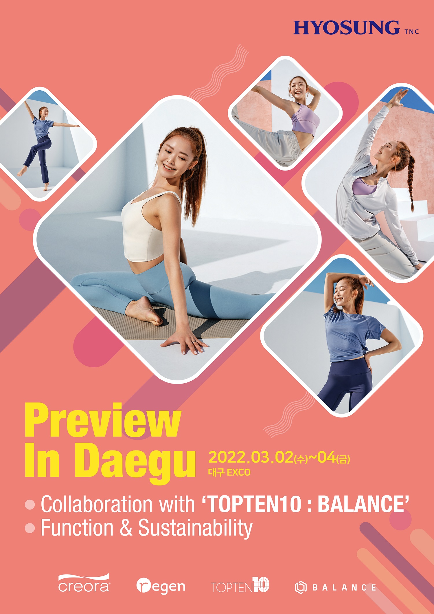 이번 전시회에서 효성티앤씨는 국내 대표 SPA 브랜드인 탑텐과 협업해 전시 부스를 공동으로 꾸리고, 탑텐의 레깅스, 팬츠 등 액티브웨어인 ‘밸런스’ 제품들을 대거 선보입니다.