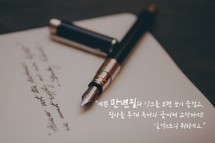 “만년필 수집. 예쁜 만년필과 잉크를 보면 눈이 즐겁고, 필사를 통해 독서와 글씨체 교정까지! 일석n조의 취미에요. 저가~중저가로도 충분히 즐길 수 있고, 본인에게 맞는 브랜드와 닙(펜촉)을 찾는 재미가 쏠쏠합니다~”