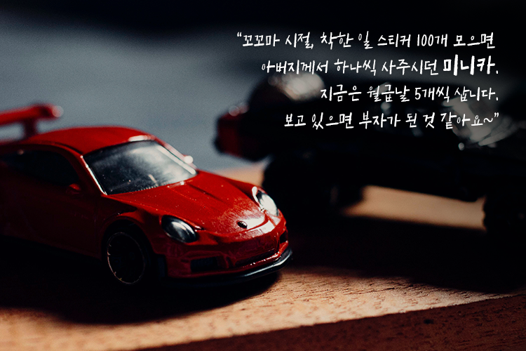“미니카 모으는 게 취미입니다. 꼬꼬마 시절, 착한 일 스티커 100개 모으면 아버지께서 하나씩 사주시곤 하셨는데… 얼마나 기다리고 기다렸는지. 지금은 월급날 5개씩 삽니다. 보고 있으면 부자가 된 것 같아요~”