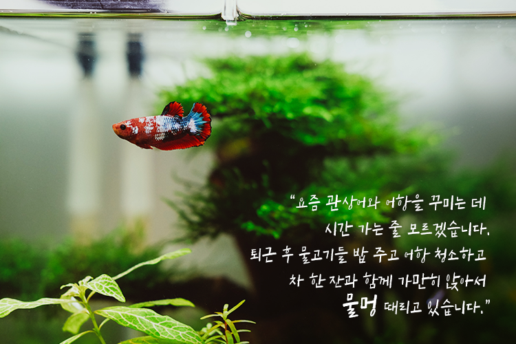 “저는 요즘 물멍하는 취미가 생겨서 관상어와 어항을 꾸미는 데 시간 가는 줄 모르겠습니다. 퇴근 후 물고기들 밥 주고 어항 청소하고 차 한 잔과 함께 가만히 앉아서 물멍 때리고 있습니다.”