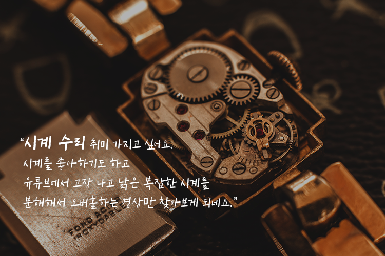 “시계 수리 취미 가지고 싶어요. 시계를 좋아하기도 하고 유튜브에서 고장 나고 낡은 복잡한 시계(특히 명품시계)를 분해해서 오버홀하는 영상만 찾아보게 되네요. ㅎㅎ 돈도 많이 들어갈 것 같긴 한데 도전해보고는 싶어요.”