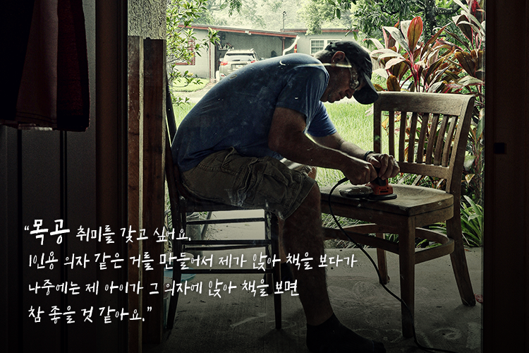 “목공 취미를 갖고 싶어요. 짧은 시간 동안 무언가 내게 꼭 필요한 물건을 만들어보고, 나중에는 가족과 아이를 위해 뭔가를 만들어 주고 싶어요. 예를 들면, 1인용 의자 같은 거요. 처음에는 그 의자에서 책을 보는 저의 모습에서 나중에는 아이가 그 자리에 앉아서 책을 보면 참 좋을 것 같아요.”